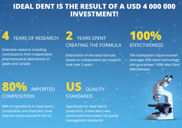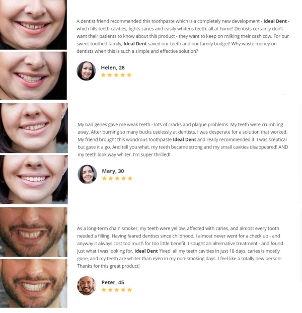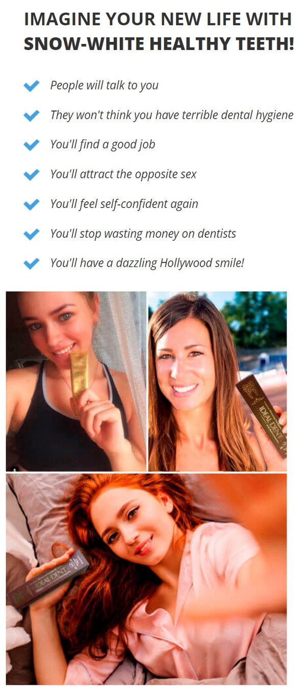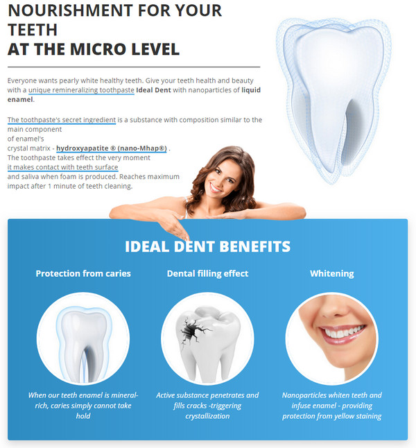 Healthy white teeth – a decoration for any person. Who does not dream of a Hollywood snow-white smile? But expensive brushing is not suitable for everyone. The sensitivity of the teeth, the enamel of the already damaged teeth, as well as the high prices are a barrier to getting a shiny smile. But dentists have found an effective, effective and at the same time gentle way to whiten teeth – this is toothpaste with the effects of filling Ideal Dent. Now everyone can become the owner of healthy teeth and a snow-white smile in just 27 days without going to the dentist!