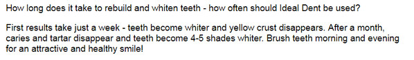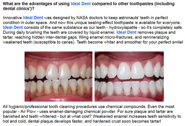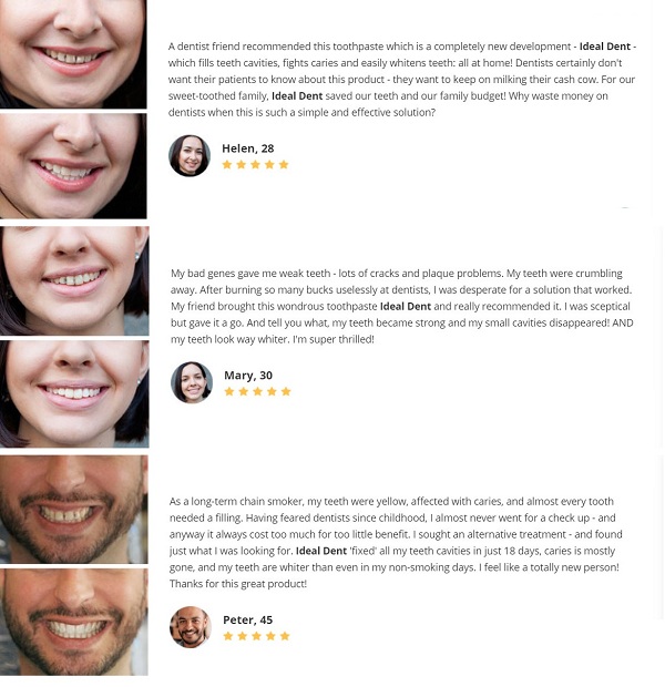 Pasta Ideal Dent is designed specifically for sensitive teeth. It strengthens the structure of enamel, mineralizes small cracks and roughness, open dental tubules.Toothpaste Ideal Dent perfectly strengthens the enamel and makes it noticeably whiter. That is why it is gaining popularity on the Internet and social networks. More than 10,000 have already tried this paste and were satisfied. Real users of Ideal Dent note the effectiveness of the tool and no longer agree to brush their teeth with anything else. After the first use, you can feel the unprecedented freshness and purity, which persist for a long time. In the process, the color of the teeth is lightened by one or two tones. In addition, cracks are filled, tooth enamel is strengthened, traces of caries disappear. Become the owners of a snow-white smile, like those who already use Ideal Dent and forget about the problems of the oral cavity. On the forums you can find a huge number of positive opinions and reviews on Ideal Dent. In their comments, users note its sparing effect, ease of use and long-term results. We did not find any negative opinions about Ideal Dent.