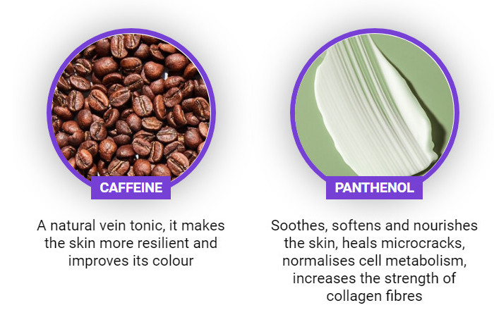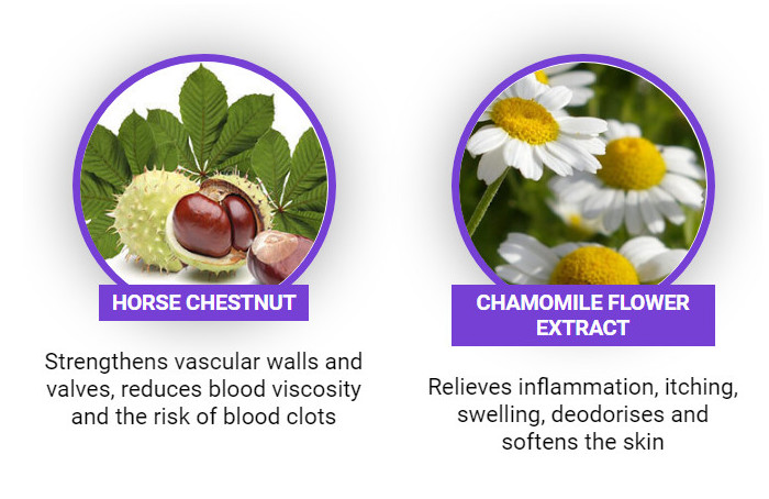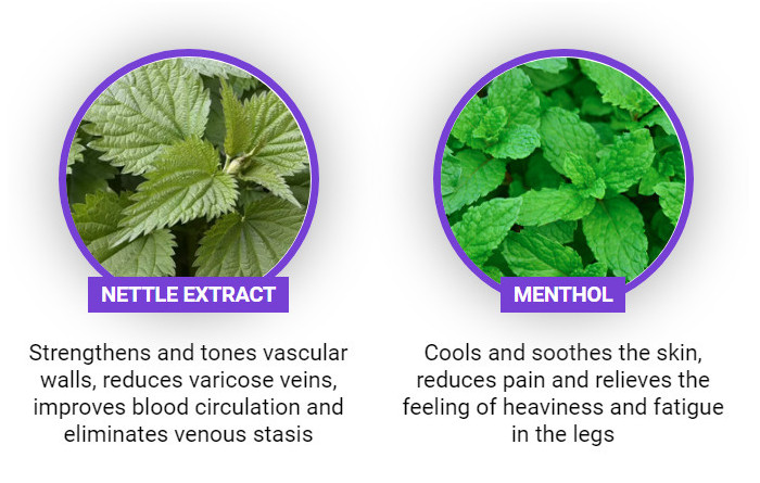 - Eliminates heaviness in the legs, itching, burning.