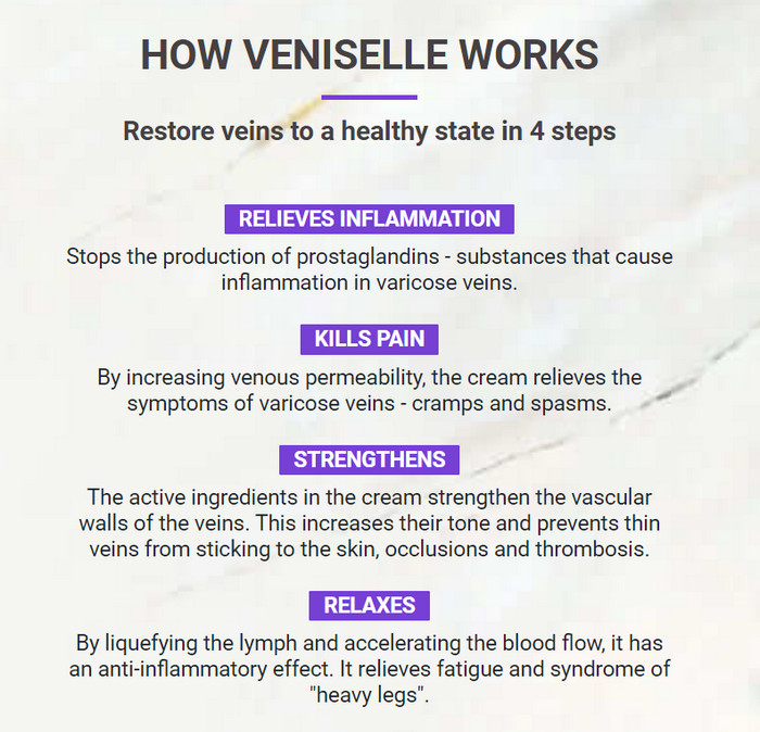 Although Veniselle is aimed at combating varicose veins, its action also affects other areas.