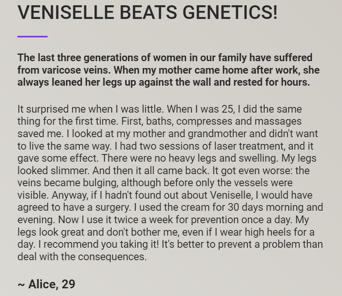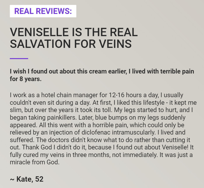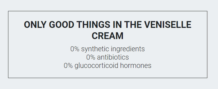 Cream Veniselle has long established itself in the world market. You can buy Veniselle at a bargain price in Russia relatively recently, but it has already earned a positive reputation. The effect of the remedy After completing the Veniselle course, positive changes are immediately noticeable. It should be remembered that this is a herbal remedy and the reaction of the body is purely individual.