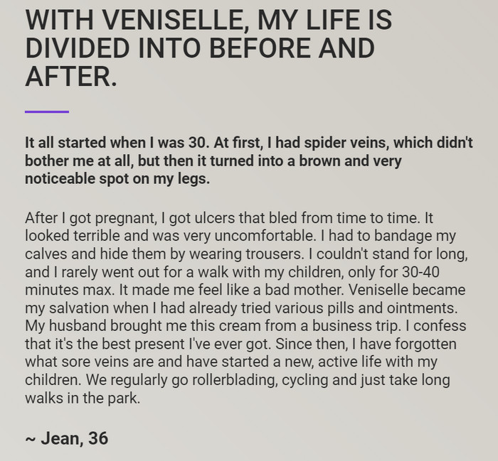 Veniselle is easy to apply at home – it absorbs quickly, does not stain clothes and does not require additional work. This is a quick and convenient remedy for combating varicose veins.
